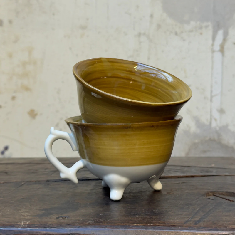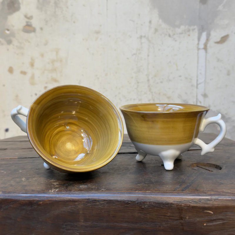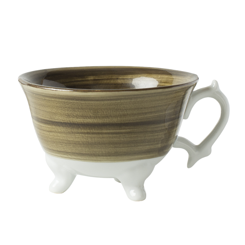 En vacker porslinskopp på tre små fötter.