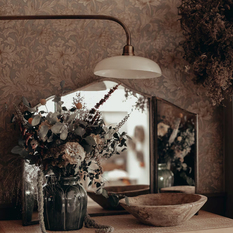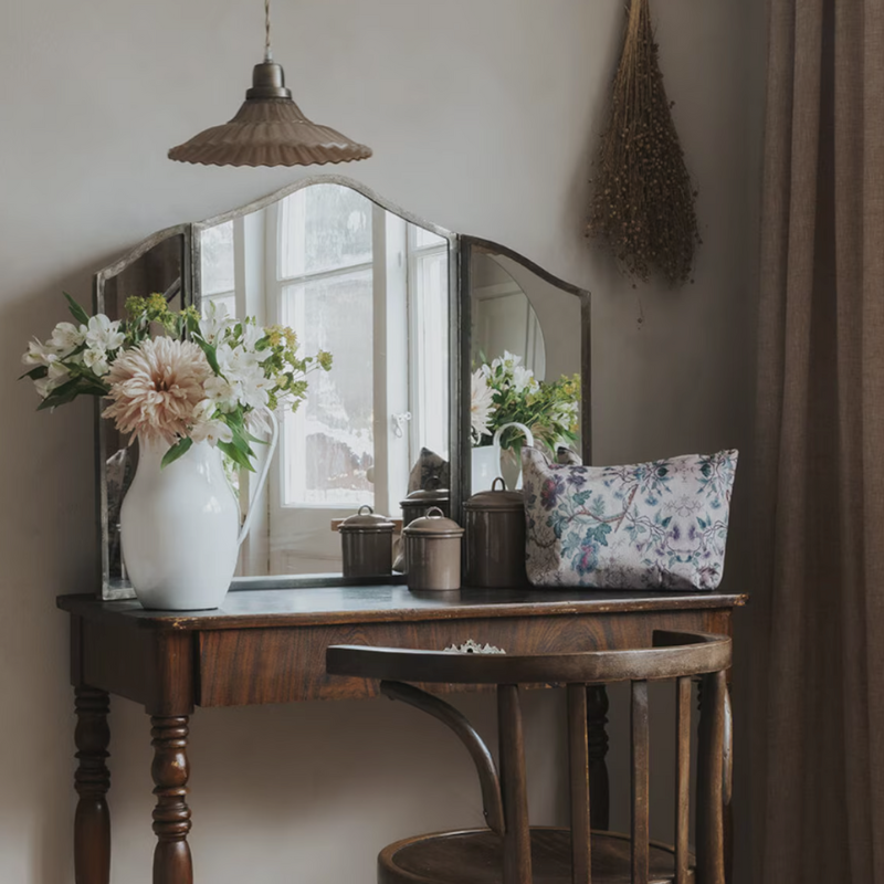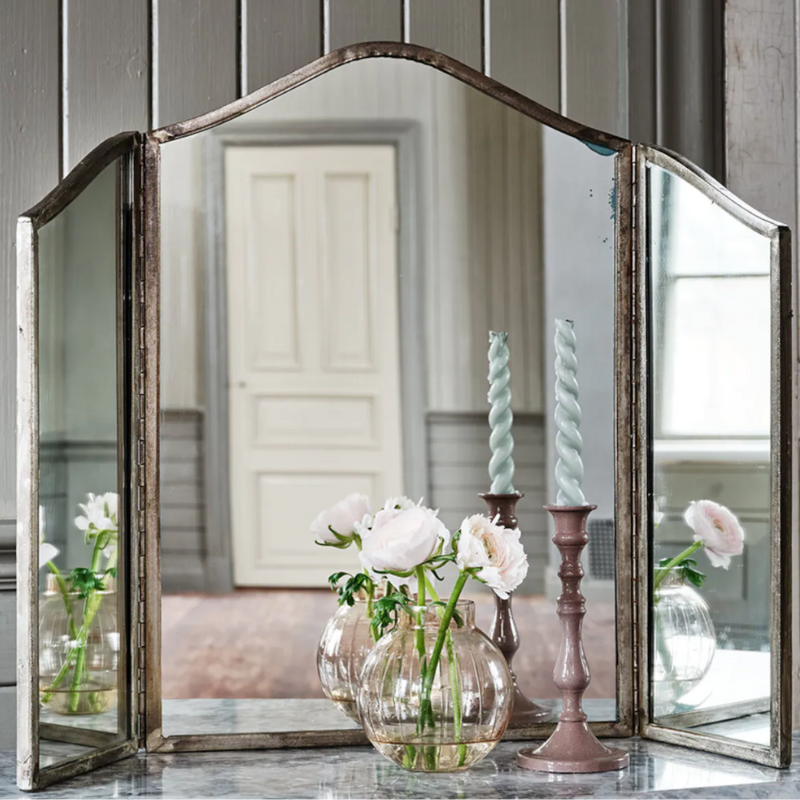 Vacker gammaldags vikbar spegel med antiksilverfärgad finish. Placera på ett sminkbord eller byrå eller häng upp. De två yttre delarna går att fälla in.